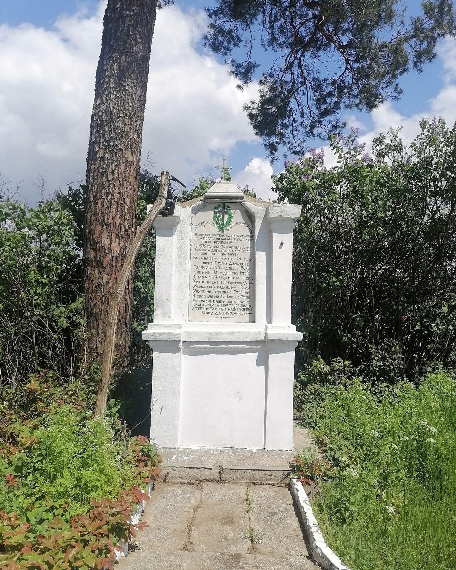 „Надгробенъ памятникъ. Не чюдися зрителю съ насъ смьртнитѣ, а поглѣдни какъвъ е ужасъ турското бесчеловѣчіе. Въ 1876 година 30ій априль Афусъ пашовата дива сганъ насъ цѣло семейство тука загуби. Баща на семейство съмъ 70 годишенъ Стоянъ Джуджевъ. Съпруга-ми 63 годишна Рада. Синъ ми 35 годишенъ Стойо. Снаха ми 30 годишна Нена. Храненица ми 12 годишна Дела. Унука ми 9 годишна Рада. Унуче ми 1 годишно Стоянчо. И съсѣдче ми 6 мѣсечно Стойо. Жѣртва сме и ние осмина братко българину за твоята свобода, а тебѣ остая като най бѣсцѣнъ залогъ да я съхранишь“.